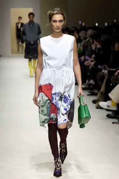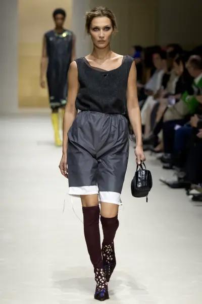 Для свого повернення Белла кардинально змінила імідж, з'явившись з ефектним макіяжем smoky eyes та світлим волоссям. Її вихід розпочався з масивного оверсайз-жакета та прозорого тренча з органзи, під якими поступово відкривалися біла сукня-футляр із принтом, а згодом — легка в'язана майка та шорти-блумери. Такий динамічний підхід дозволив глядачам розгледіти складну структуру колекції. Незважаючи на попередні труднощі, пов'язані з хворобою Лайма, на подіумі в Мілані модель мала впевнений та енергійний вигляд.
