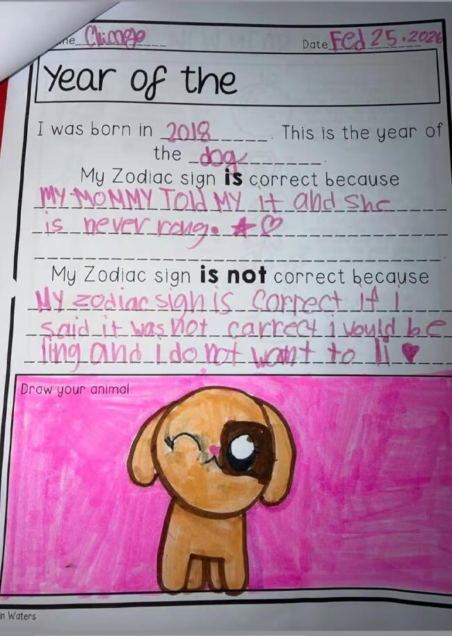 Діти Кім Кардаш'ян звикли до підвищеної уваги, проте остання публікація зірки реалітішоу зумовила не стільки захоплення, скільки хвилю критики в мережі. Засновниця SKIMS поділилася в Instagram фотографією домашнього завдання своєї восьмирічної доньки Чикаго. На знімку видно аркуш, де дівчинка яскраво-рожевим маркером відповідала на запитання про свій знак зодіаку за китайським календарем — Рік Собаки — та пояснювала, як ці характеристики описують її особистість.