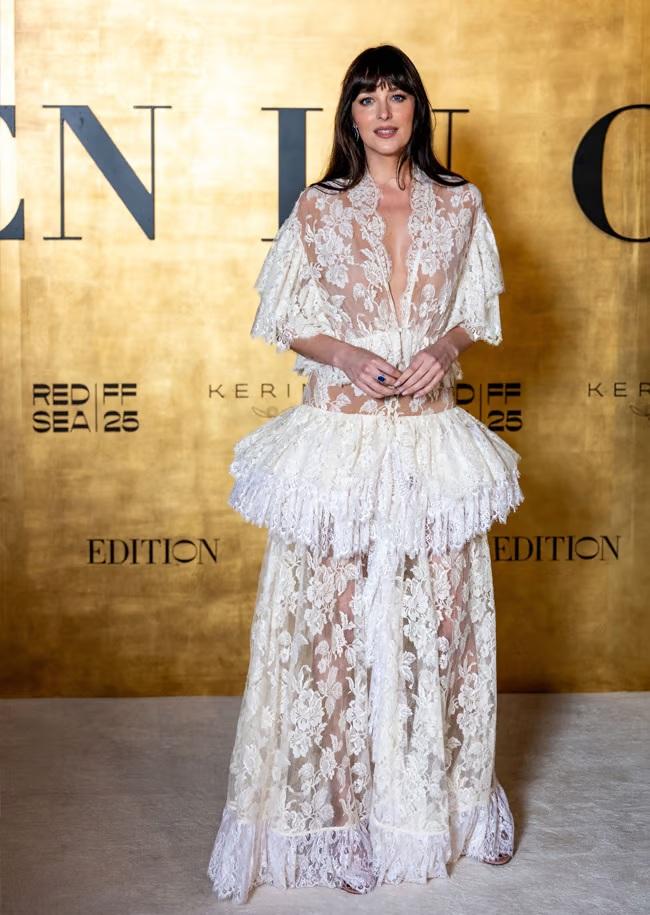 Акторка Дакота Джонсон відома своєю схильністю до прозорих суконь, додала до свого репертуару ще один прозорий образ. Вона обрала романтичний дизайн від Chloé у стилі бохошик, прикрашений витонченим квітковим мереживом та скульптурними рюшами. Сукня мала глибокий виріз та багаторівневі деталі на стегнах, що надавало образу м'якості й ефірності. Джонсон доповнила ансамбль мінімалістичними туфлями від Paris Texas та блискучими прикрасами Chopard.