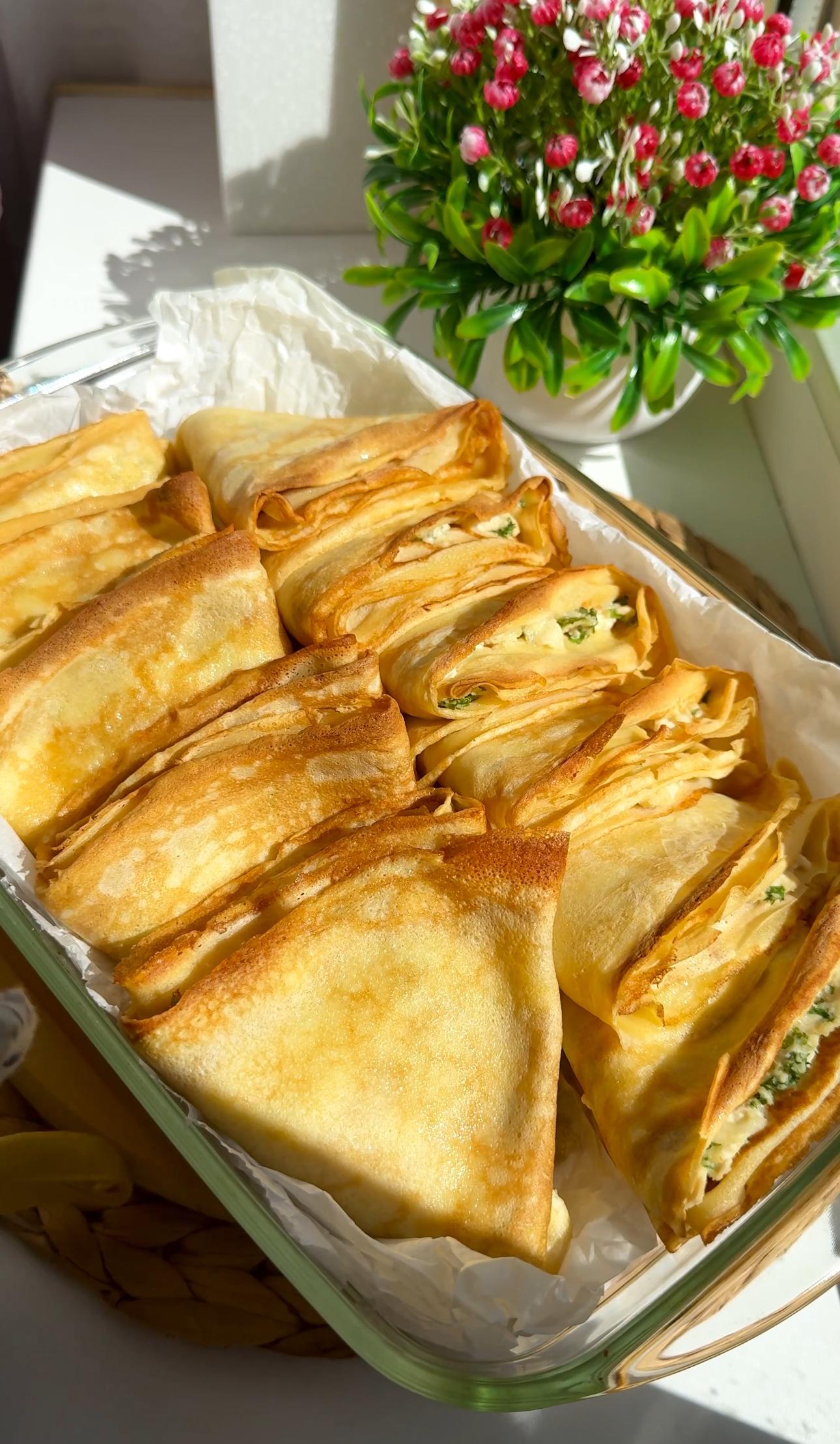 Інгредієнти: (на млинці) 3 яйця, 180 мл молока, 150 г борошна, чайна ложка солі, чайна ложка цукру, 1/3 ч. л. соди, 2 ст. л. олії; (на начинку) 500 г курячого філе, 180 г твердого сиру, 2–3 ст. л. сметани або майонезу, улюблена зелень.