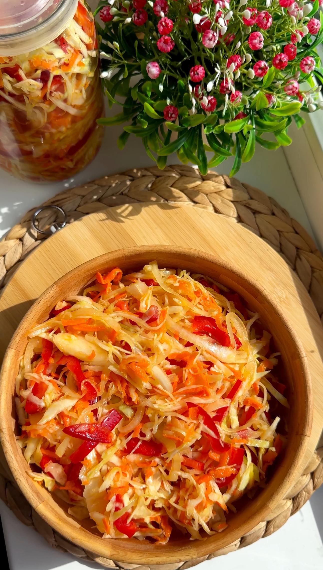 Інгредієнти: (на одну трилітрову банку або на дві півторалітрові) 5 кг капусти, 3 червоні перчини, 3 цибулини, 2–3 морквини, 50 г солі, 100 г цукру, 150 мл олії, 80 мл оцту.