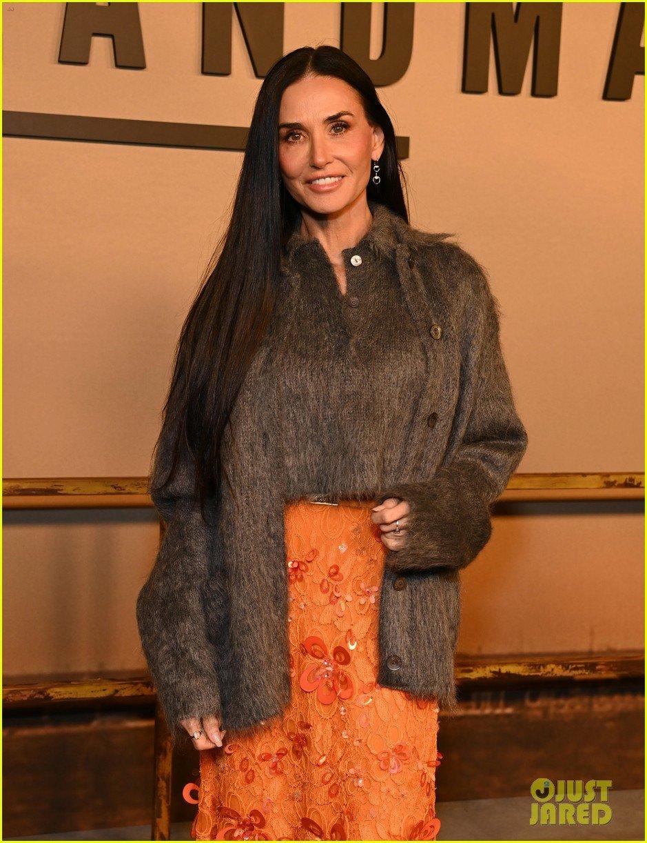 Щоб збалансувати затишний верх, Демі додала яскравий акцент — помаранчеву спідницю-міді, прикрашену об'ємними 3D-квітковими аплікаціями. Решта ансамблю була стриманою: пряме розпущене волосся, ніжний макіяж та витончені сережки. Улітку такий образ демонструвала Дуа Ліпа, що підтверджує: сміливі поєднання текстур та кольорів є актуальними для різних поколінь.