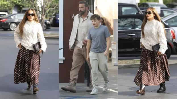Попри тривалий процес розлучення, пара проводить час разом, що підігріває чутки про їхні неоднозначні стосунки. Для сімейного обіду в Brentwood Country Mart Джей Ло обрала образ, який кардинально відрізнявся від її звичних відвертих сценічних вбрань: вона з'явилася в елегантній коричнево-білій сукні-міді в горошок, доповненій затишним білим светром від Brunello Cucinelli.