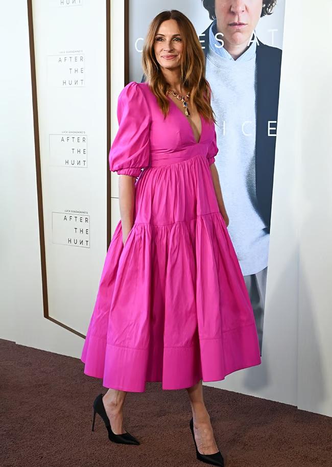 Для заходу в Лос-Анджелесі 57-річна зірка, відома завдяки «Красуні», обрала ефектну яскраво-рожеву сукню-міді з глибоким вирізом. Сукня з пишними рукавами додала весняного настрою в осінній сезон. Декольте доповнювало масивне кольє з різнокольорових коштовностей. Джулія залишила каштанове волосся розпущеним, завершивши образ рожевим клатчем та класичними чорними туфлями на підборах.