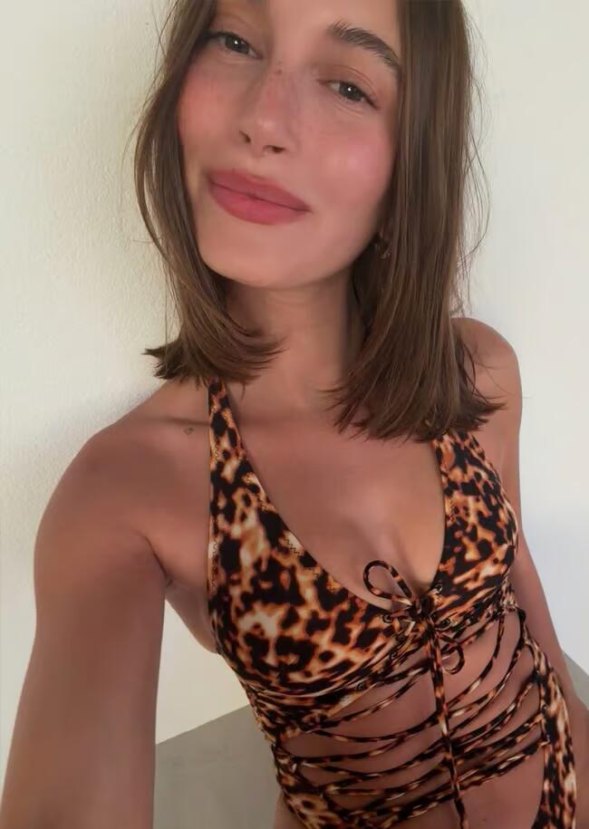 На нових знімках 29-річна ікона стилю позувала в ультраглибокому купальнику з гепардовим принтом та фасоном халтер. Особливу увагу привернув драматичний виріз від ребер до самого тазу, підкреслюючи бездоганний прес зірки. Образ доповнювала витончена шнурівка, яка фіксувала ліф і додавала вигляду особливої зухвалості. Також Гейлі показала більш класичний, але не менш ефектний варіант — чорний монокіні з рюшами та мереживними деталями на грудях.