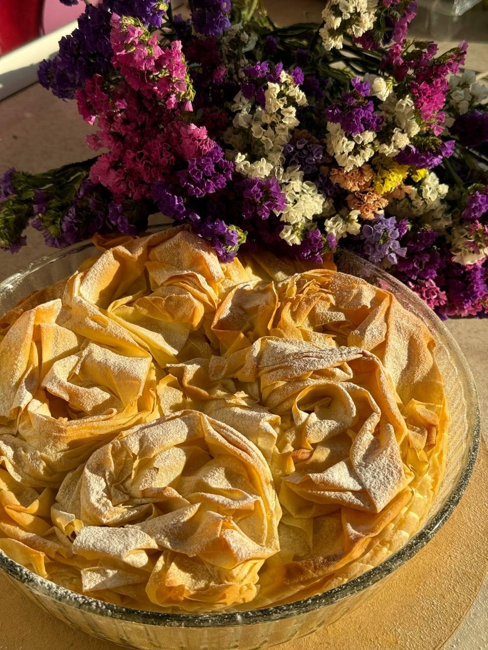 Приготування. Яйця, крем-сир, сметану, цукор та кукурудзяний крохмаль перемішати до однорідності. Заливка буде рідкою, але під час випікання все схопиться та нагадуватиме чизкейк. Листи тіста філо розморозити і змастити розтопленим маслом. На дно форми викласти спершу чотири листи. Далі викласти заливку. Зверху викласти три змащені маслом листи філо, один за одним. Зверху додати яблука, а на них декілька листів філо, складених у вигляді квіточки. Так під час випікання сформуються гарні хвилі. Випікати 40 хвилин за температури 180 градусів.