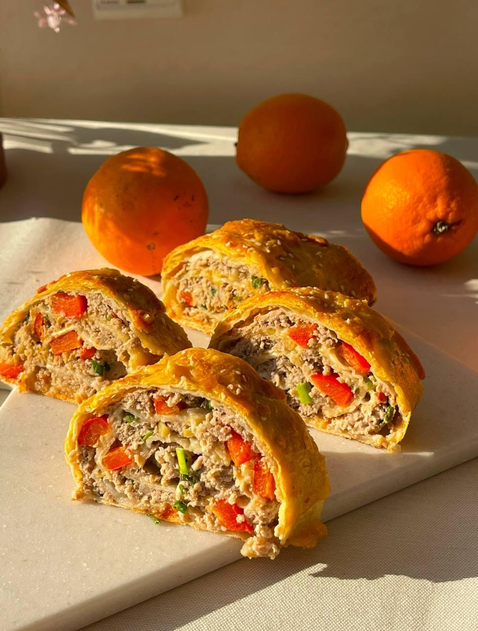 Інгредієнти: фарш, яйце, 2–3 зелені цибулини, маленька червона перчина, сіль, мелений чорний перець, твердий сир, 2 великих лаваші, яєчний жовток, насіння кунжуту.