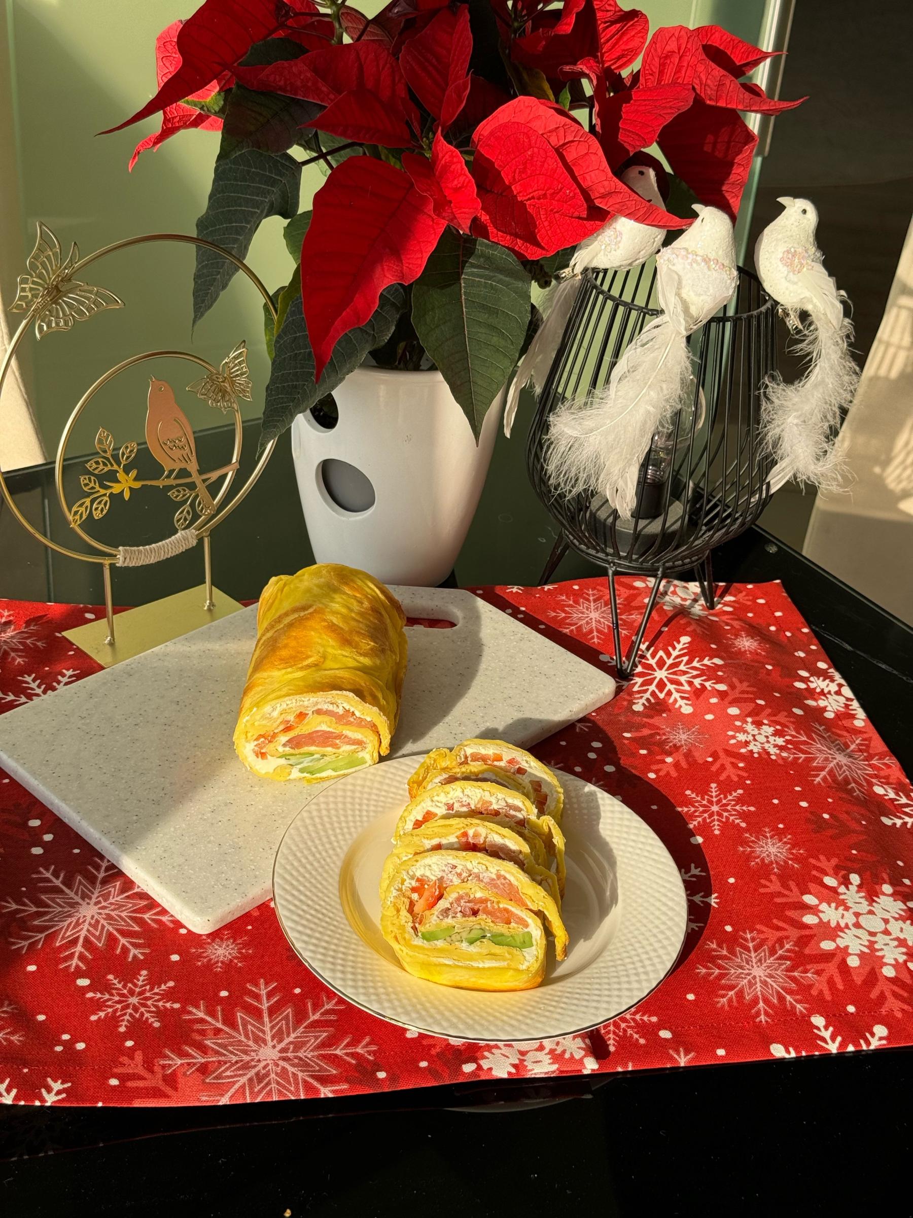 Інгредієнти: (на млинець) 3 яйця, 150 мл молока, столова ложка сметани, чайна ложка солі, 100 г борошна, 10 мл олії; (на начинку) 400–500 г вершкового сиру, 200 г слабкосоленої червоної риби, авокадо, половинка солодкого перцю.