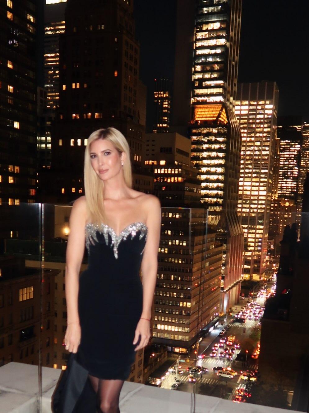 44-й день народження доньки президента відзначили запізнілою вечіркою на даху Нью-Йорка. На опублікованих кадрах Іванка позує в елегантній чорній мінісукні без бретелей, прикрашеній мерехтливими блискітками вздовж декольте, у прозорих чорних колготках та туфлях на ремінці. Її образ, доповнений розпущеним світлим волоссям і бездоганним макіяжем, випромінював розкіш та гламур.