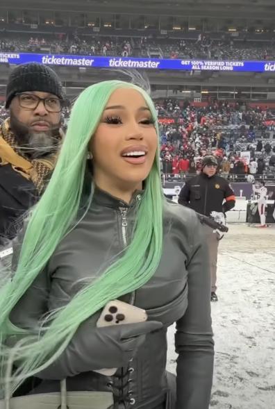 Особливою родзинкою стилю Карді стала її нова екстремальна зачіска — пряме м’ятно-зелене волосся завдовжки до талії, яке яскраво контрастувало із суворим сірим вбранням. Щоб не замерзнути під час чемпіонату АФК, суперзірка накинула розкішну хутряну шубу відповідного відтінку, а згодом змінила її на фірмову кепку чемпіонів AFC, демонструючи підтримку команді коханого. Стефон Діггс не приховував свого захоплення в Instagram, зізнавшись у коханні до Карді та її вибору кольору. Пара, яка у листопаді 2025 року відсвяткувала народження спільного сина, мала неймовірно щасливий вигляд на полі, обіймаючись під прицілом сотень камер.