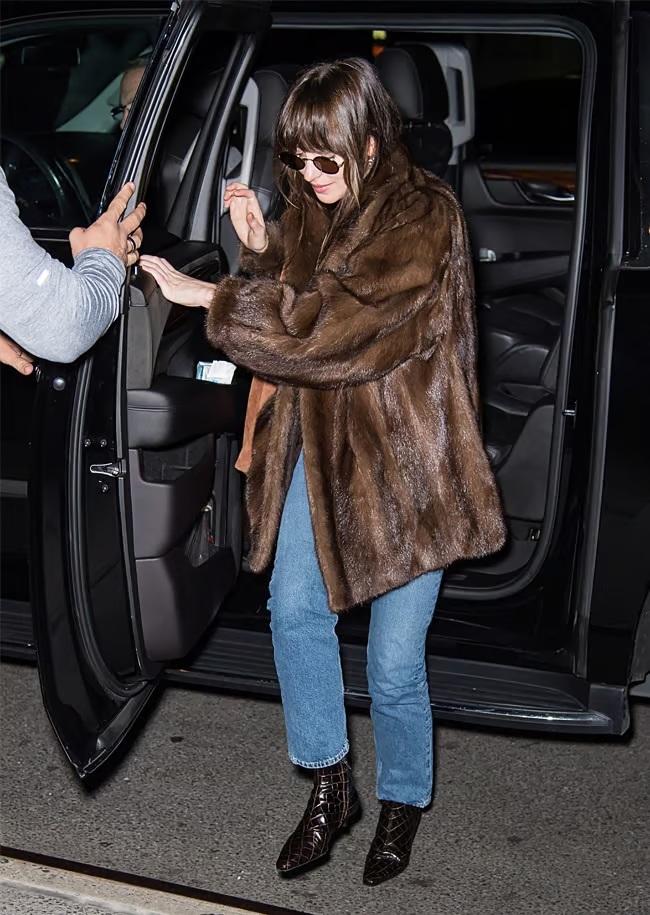 • Завершила образ світло-коричневою сумкою-тоут, чорними сонцезахисними окулярами та чорними черевиками до щиколотки. Образ Дакоти доводить, що джинси-сигарети чудово поєднуються з різними стилями взуття, що робить їх універсальним варіантом для всіх сезонів.