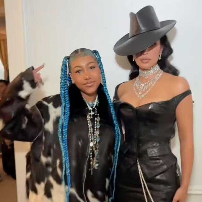 Норт Вест тим часом була майже невпізнанною. Вона обрала мішкуватий повністю чорний ансамбль, а її зовнішній вигляд доповнювало довге блакитне волосся, знебарвлені брови та темні сонцезахисні окуляри. Шанувальники швидко поділилися своїми неоднозначними думками в соціальних мережах, зокрема критикуючи вибір одягу Кім: