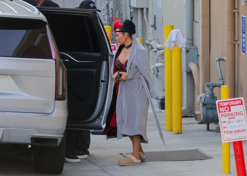 Кім Кардаш'ян вкотре довела, що здатна привернути до себе всю увагу, навіть перебуваючи на робочому майданчику. Цього тижня зірку реалітішоу помітили в Лос-Анджелесі під час зйомок нової повнометражної комедії «П’яте колесо». Кім постала перед камерами в екстравагантному чорно-червоному боді-корсеті, рясно прикрашеному коштовним камінням. Образ доповнював величний головний убір із червоного пір'я, чорний чокер та розкішна накидка, що підкреслювала тематику виступів у стилі Лас-Вегаса. Попри гламурне вбрання, у перервах між дублями зірка віддала перевагу комфорту, накинувши поверх костюма сірий халат та взувши домашні капці в стилі угг.
