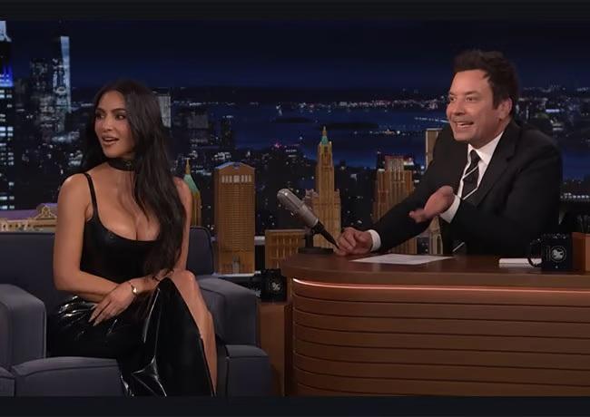 Кім Кардаш'ян неочікувано відвідала The Tonight Show Starring Jimmy Fallon, щоб прорекламувати свою нову колаборацію з Nike під брендом Skims. На шоу знаменитість обрала латексну сукню від Vex з високим розрізом та чокером, доповнивши образ мюлями на платформі та срібним браслетом.