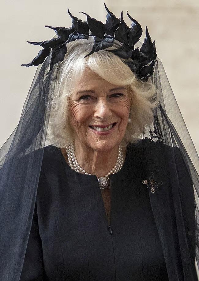 Камілла одягла чорну шовкову сукню-міді з довгими рукавами, яку доповнила чорними прозорими колготками та туфлями на підборах. Найбільш дискусійним елементом став її головний убір.