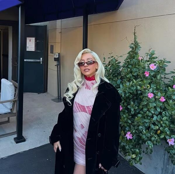 Зірка серіалу «Бурлеск» доповнила образ високими червоними чоботами Christian Louboutin Miss Z із загостреним носком, які, на думку деяких користувачів, натякали на різдвяну цукерку-тростину. Її культове біляве волосся було укладене в об’ємну кучеряву зачіску з бічним проділом, а макіяж був бездоганним: срібні тіні, чорна підводка та нюдові губи.