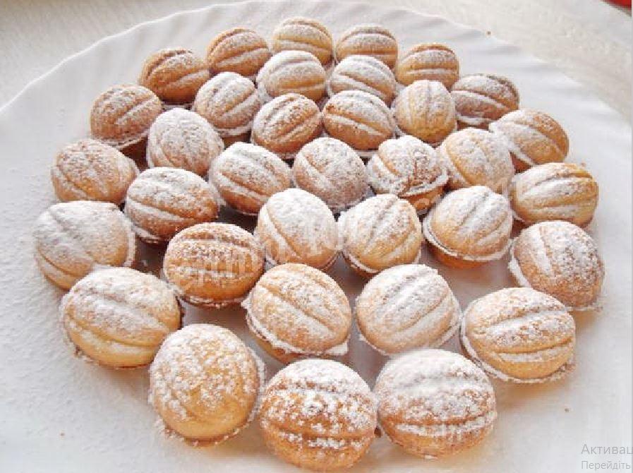 Спершу потрібно змішати дрібно перемелені горіхи із цукром та борошном, перемішати, додати розтоплене масло, збите яйце (як на омлет), сметану і замісити тісто. Далі взяти формочки, ретельно змастити їх олією (чи смальцем) і сформувати горішки. Випікати в духовій шафі за температури 180 градусів 20–25 хвилин. Потім вийняти горішки з формочок. Коли вони трохи вистигнуть, натерти, щоб вирівняти краї (крихту з них залишити!).
