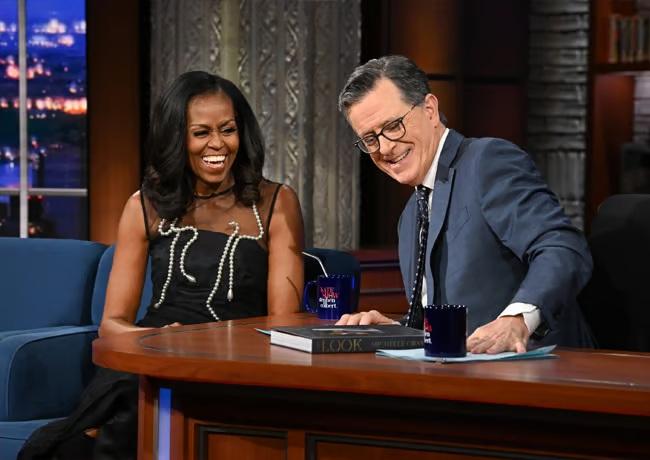 Мішель Обама знову опинилася в центрі уваги публіки завдяки своїй останній появі на телебаченні. Колишня перша леді дала інтерв'ю Стівену Колберту в його пізньому вечірньому шоу The Late Show with Stephen Colbert, де вона не лише поділилася подробицями свого життя, а й продемонструвала суперелегантний образ, який швидко потрапив у заголовки газет. Для виступу вона обрала шикарну чорну сукню-міді, яка мала прозорий верх та однотонну спідницю. Унікального дизайну вбранню додали перлинні прикраси спереду, що надало йому особливої елегантності та витонченості.