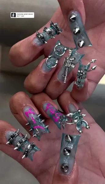 Норт Вест, старша донька Кім Кардаш’ян та Каньє Веста, вкотре довела, що не боїться радикального самовираження. Цього четверга 12-річна зірка соцмереж продемонструвала у своїх Instagram Stories неймовірний манікюр: довгі аквамаринові нігті, прикрашені металевим пірсингом, срібними шипами та підвісками. На двох пальцях лівої руки навіть помітили японські ієрогліфи North-chan — пряме відсилання до її куплету в треку Bomb батька-репера.