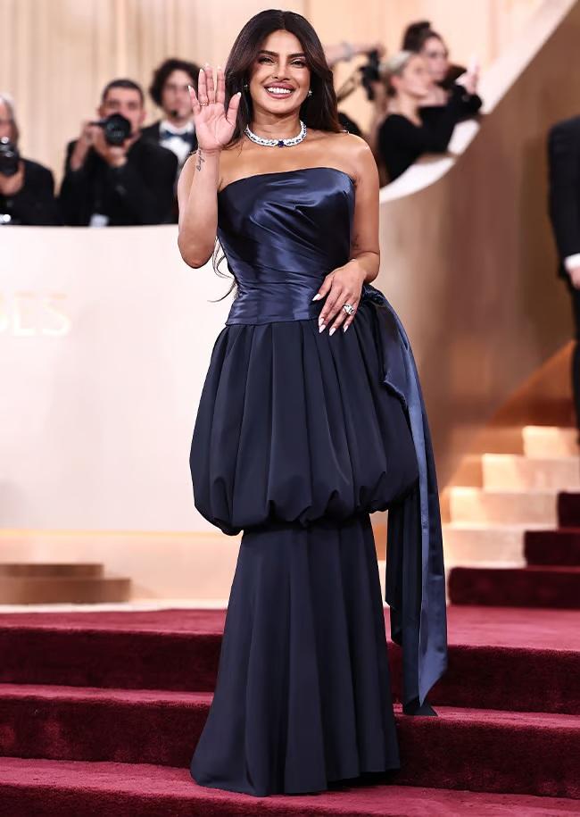 Акторка Пріянка Чопра разом зі своїм чоловіком Ніком Джонасом прикували до себе всі погляди на 83-й церемонії вручення премії «Золотий глобус» у Лос-Анджелесі. Поки Нік дотримувався бездоганної класики в елегантному смокінгу, Пріянка обрала для виходу темно-синє творіння від Dior. Сукня без бретелей з атласним ліфом, оздобленим рюшами, та контрастною матовою спідницею у стилі «бульбашка» створила величний і водночас грайливий силует. Як амбасадорка бренду Bulgari, актриса доповнила ансамбль ефектним кольє із синіми акцентами, яке ідеально гармоніювало з її теплим бронзовим макіяжем та ніжними кораловими губами.