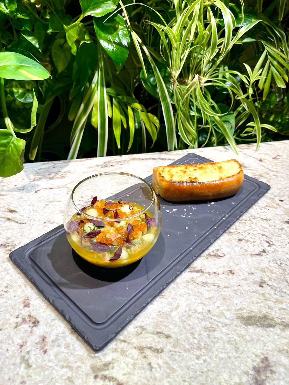 (на порцію) 100 г лосося, 15 г мусу з авокадо, 5 г чилі, 3 г зеленої цибулі, 10 г оливкової олії, грам солі, 30 г манго-цитрусового соусу, 5 г червоної ікри, 10 г компресованого яблука, грам м’яти, грам мікрозелені; (на мус з авокадо) авокадо, вершки, імбир, сік і цедра лимона, сіль; (на манго-цитрусовий соус) 5 г яблучного оцту, 15 г пюре манго, 7 г апельсинового фрешу, 4 г лаймового фрешу, 7 г грейпфрутового фрешу, 2 г лимонного фрешу, грам шрирача, грам солі, 15 г цукру, грам ксантану.