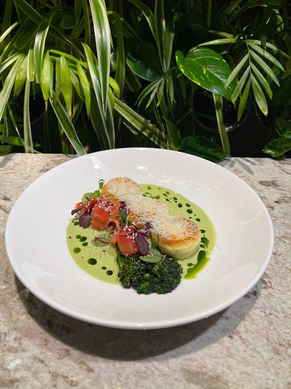 Інгредієнти: (на порцію) 120 г кисломолочного сиру (9% жирності), 20 г сиру фета, 10 г борошна, 3 яйця, 30 г броколіні, 30 г лосося слабкосоленого, 3 г пармезану, грам кунжуту, 2 г мікрозелені; (на соус «Песто») 10 г базиліку, 5 г лимонного фрешу, 10 г пармезану, 30 г оливкової олії, 5 г горіхів, 70 г грецького йогурту, грам солі.