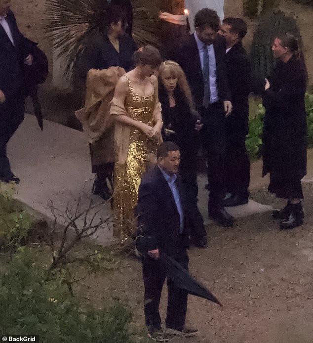 Згідно з кадрами інсайдерів, Свіфт обрала довгу сукню-максі з крепдешину вартістю 3650 доларів, яка ексклюзивно представлена на Net-a-Porter. Вбрання з тонкими бретельками та глибоким вирізом декольте було повністю розшите золотими блискітками. Тейлор доповнила розкішний образ відповідною золотою шаллю, а волосся зібрала в елегантний низький пучок, що додало вигляду «невимушеного шику». На весіллі співачка проводила час у компанії легендарної Стіві Нікс та Алани Хаїм, що породило справжній захват у фанатів.