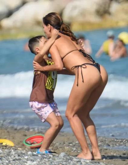 На одному зі знімків Лонгорія відвернулася від камери, демонструючи свої підтягнуті сідниці. На інших фото вона, ніби позуючи для зйомки, прогулюється пляжем, поправляє хвіст та розмовляє по телефону. Під час відпочинку акторку також сфотографували разом з її семирічним сином Сантьяго Бастоном, якого вона ніжно обіймала та цілувала. Вона також тримала його за руку, ведучи до моря.
