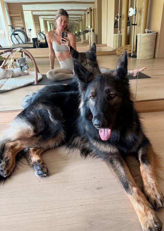 45-річна бразильська супермодель, яка нещодавно випустила кулінарну книгу Nourish, почала серію фотографій із селфі перед дзеркалом, позуючи на килимку для йоги. Жизель була одягнена у світло-сірий комплект для тренувань: обтислий кроптоп та легінси з високою талією. Компанію на цьому знімку їй склала її улюблена німецька вівчарка Елфі.