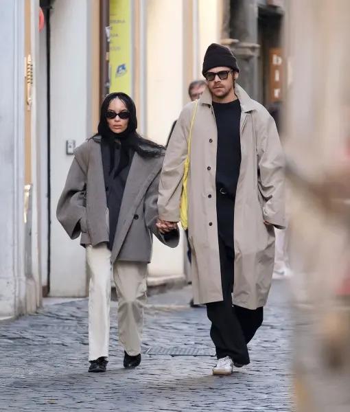 На фотографіях Гаррі Стайлз одягнений у чорний светр і штани під елегантним бежевим тренчем. Свій повсякденний образ він доповнив чорною шапкою та темними окулярами. Зої Кравіц стояла поруч зі своїм коханим у сірому бушлаті, темно-силому кардигані та штанах хакі. Вона стильно прикрила свої коси чорною хусткою, пов'язаною навколо голови.